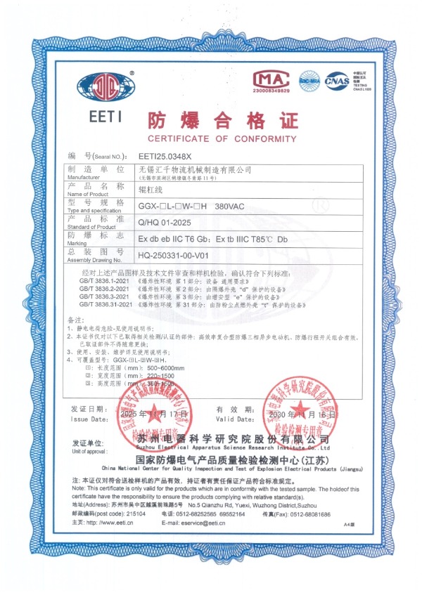 সম্প্রতি, Wuxi Huiqian Logistics Machinery Manufacturing Co., Ltd.-এর মূল পণ্য—রোলার কনভেয়র—সফলভাবে কঠোর পরীক্ষায় উত্তীর্ণ হয়েছে এবং আনুষ্ঠানিকভাবে EETI বিস্ফোরণ-প্রমাণ শংসাপত্র পেয়েছে! এই শংসাপত্রটি নির্দেশ করে যে Huiqian-এর রোলার কনভেয়ারের বিস্ফোরণ-প্রমাণ কার্যকারিতা আন্তর্জাতিকভাবে স্বীকৃত নিরাপত্তা মান পূরণ করে, পেট্রোকেমিক্যাল, কয়লা খনির, ফার্মাসিউটিক্যালস, এবং সামরিক শিল্পের মতো উচ্চ-ঝুঁকিপূর্ণ শিল্পগুলির জন্য আরও নির্ভরযোগ্য উপাদান হ্যান্ডলিং সমাধান প্রদান করে এবং কোম্পানির প্রযুক্তিগত সক্ষমতা-প্রমাণ প্রযুক্তিগত সক্ষমতা প্রদর্শন করে।