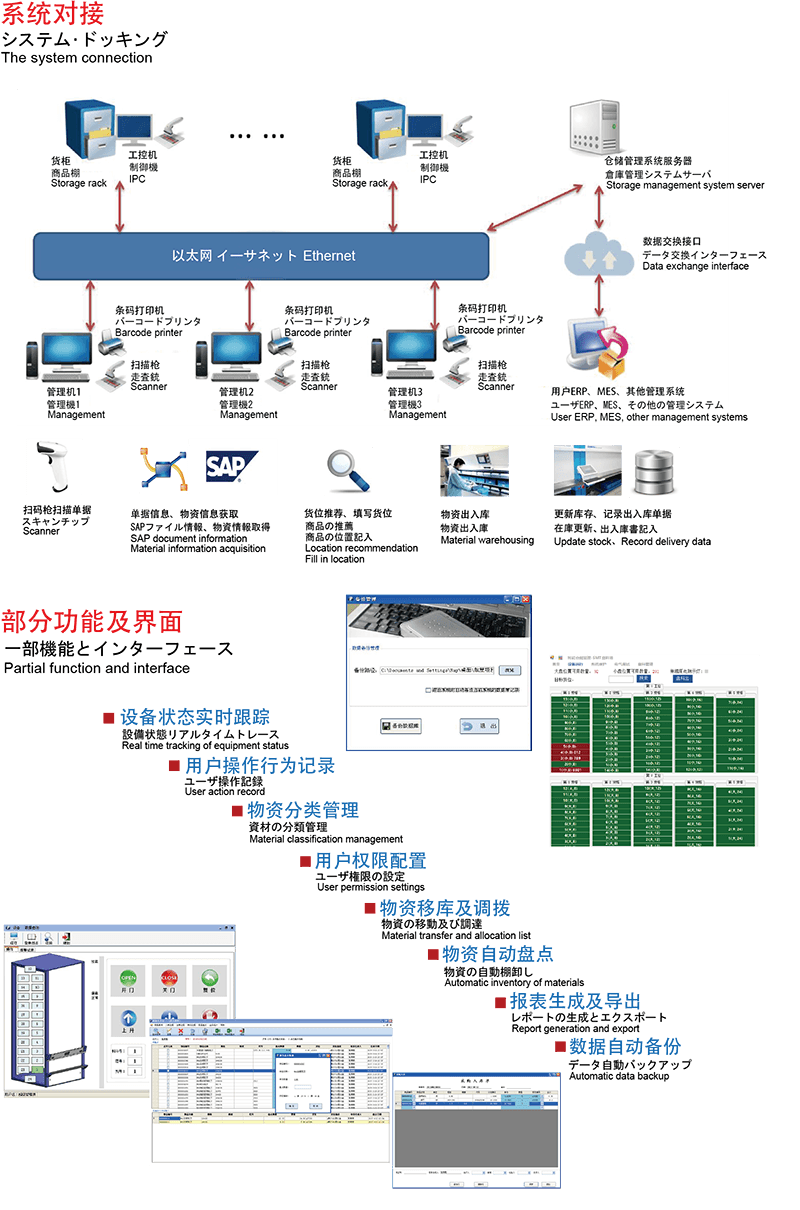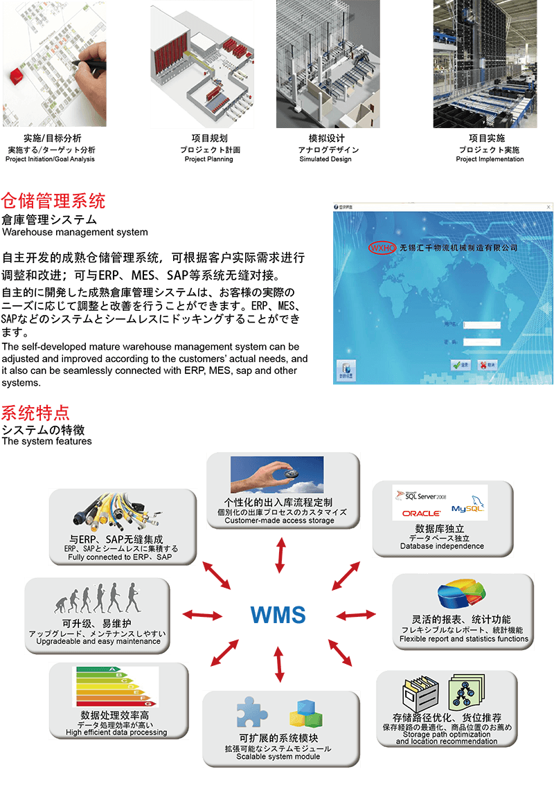 এই সমাধানগুলির কেন্দ্রবিন্দুতে রয়েছে কোম্পানির পরিপক্ক, স্বাধীনভাবে বিকাশযুক্ত গুদাম পরিচালনা ব্যবস্থা (ডাব্লুএমএস)। এই উন্নত সিস্টেমটি কেবল আধুনিক গুদামগুলির জটিলতাগুলি পরিচালনা করতে শক্তিশালী নয় তবে নমনীয়ও। এটি ক্লায়েন্টদের নির্দিষ্ট প্রয়োজনীয়তা অনুসারে সামঞ্জস্য এবং স্কেল করা যেতে পারে, এটি নিশ্চিত করে যে এটি ছোট অপারেশন এবং বৃহত আকারের উভয় উদ্যোগকে সমর্থন করে। ডাব্লুএমএস ইআরপি, এমইএস এবং এসএপি -র মতো অন্যান্য ব্যবসায়িক সিস্টেমগুলির সাথে একযোগে সংহত করে, ব্যবসায়গুলিকে তাদের ক্রিয়াকলাপ পরিচালনার জন্য একীভূত প্ল্যাটফর্ম সরবরাহ করে।