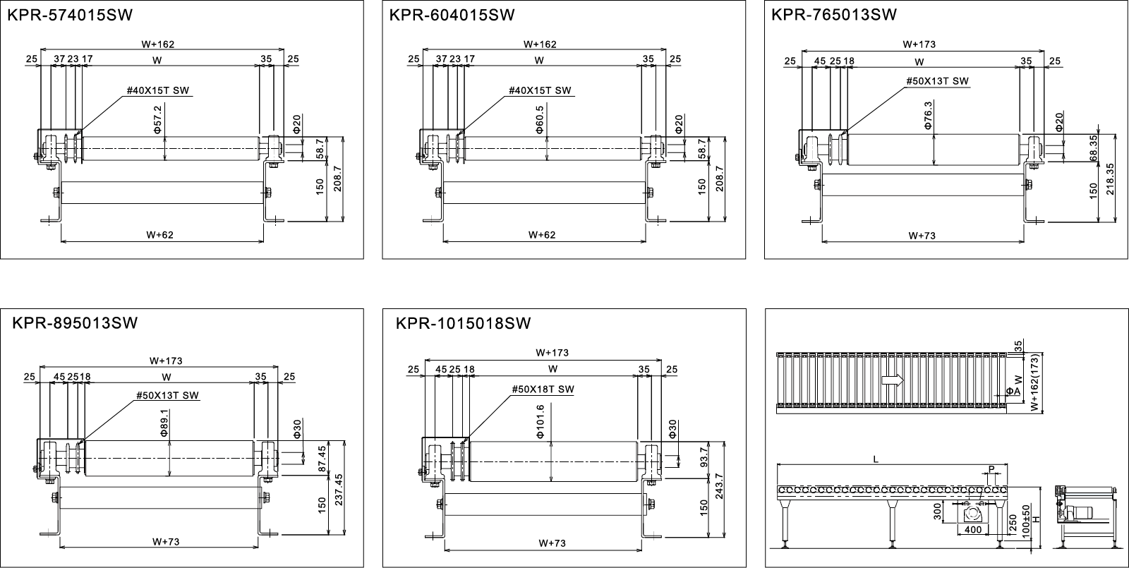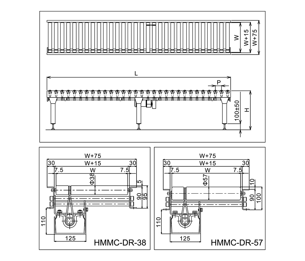 | রোলার পিচ | পি (মিমি) | 75 · 100 · 150 | 75 · 100 · 150 | 75 · 100 · 150 | 100 · 150 | 100 · 150 |